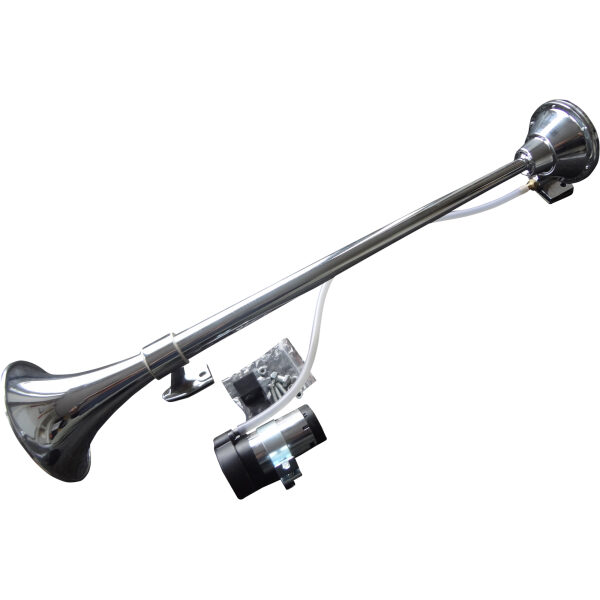 Enkele luchthoorn. Verchroomde RVS uitvoering. merk: origineel Hadley USA totale opbouwlengte: 950mm diameter tuit: Ø180mm luchtaansluiting: M12x1.5 Wordt veel gebruikt op de topmodellen van Scania. De langste hoorn met tevens de laagste toon in het Hadley assortiment.Luchthoorn Jericho + bajonet aansluiting