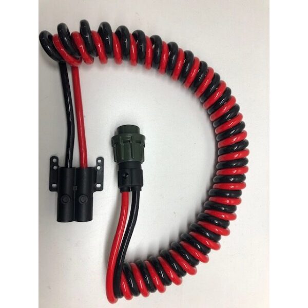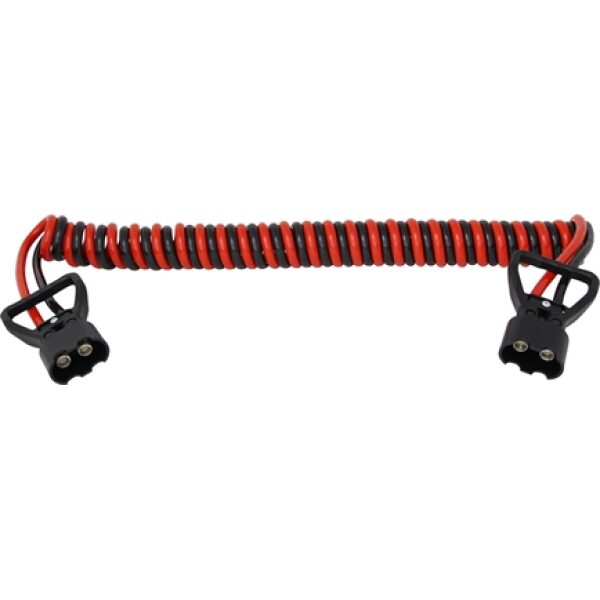 Deze spiraalkabel van 2 x 35 m2 wordt geleverd met twee aangesoldeerde Rema stekkers van 160 ampere. De spiraalkabel is onder andere geschikt als laadklepvoeding tussen een vrachtwagen en oplegger. De zwarte en rode spiraalkabels zijn in elkaar gedraaid.