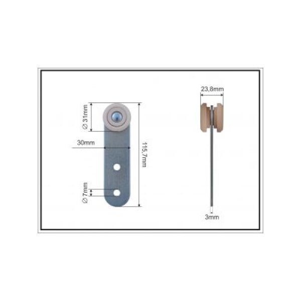 zeilrunner Sesam. totale lengte: 120mm dikte: 5mm diameter wiel: Ø24mm breedte wiel: 21mm dikte wiel: 7mm hartafstand montagegaten: 28mm diameter montagegat: Ø7mm